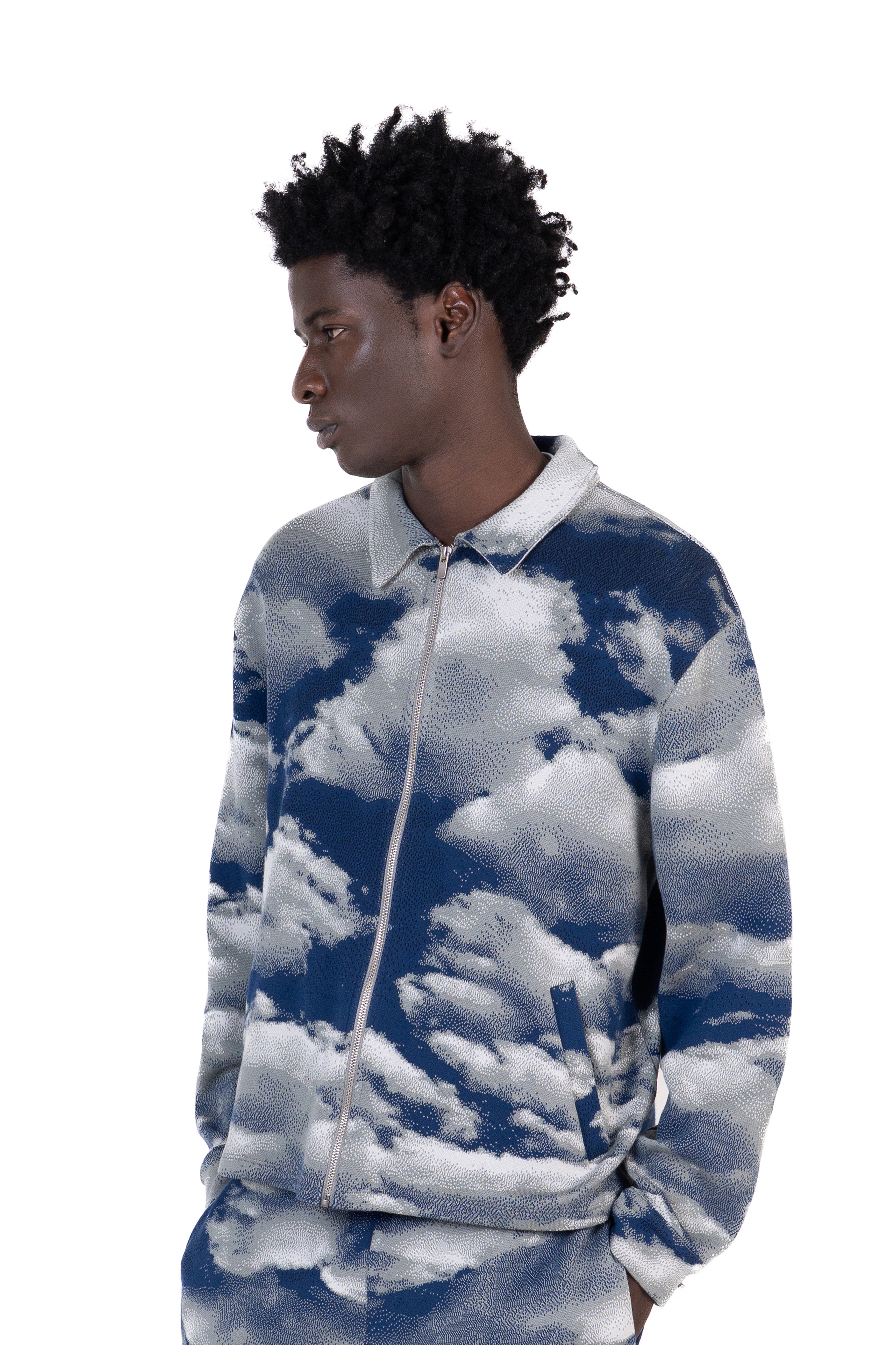 Zip-up jacket featuring the exclusive Beyond the Clouds Joe Yellino cloud jacquard pattern. A piece that expresses vision and determination, designed for those who choose to go beyond their limits.